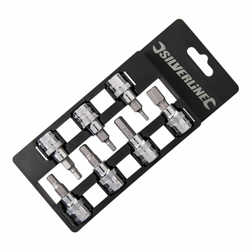 – Hardened and tempered hex bits with satin finish, mounted in polished chrome vanadium square drive sockets