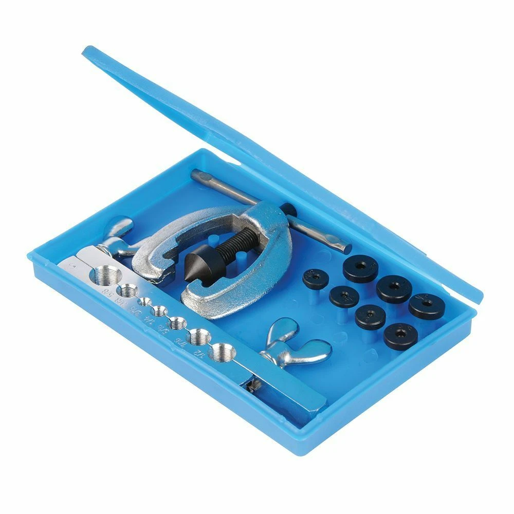 – Includes: flaring bar, 45deg screw-type flare press, and 7 x double-flare dies: 3/16in, 1/4in, 5/16in, 3/8in, 7/16in, 1/2in and 5/8in