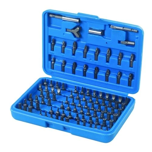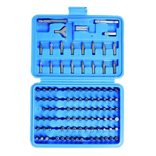 – 95 assorted chrome vanadium driver bits; slotted, Phillips, PZ, hex (standard and tamper proof, metric and imperial), Torx (standard and tamper proof), triple square and square recess, and assorted bits for electrical household appliances